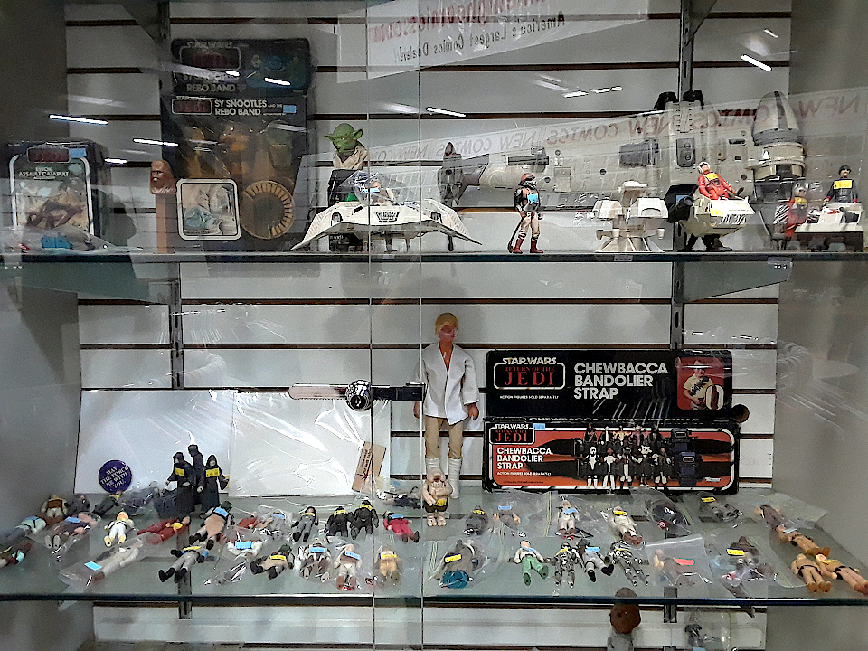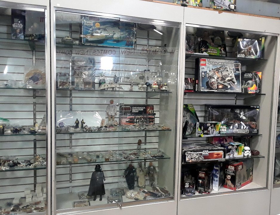 Some of the Star wars items in our Jason Street Mega Store As regards the actual Hasbro toy releases, we had none. Nor did anyone else. If I recall correctly, Lucas and Hasbro sold gift certificates during the 1977 Christmas season that promised Star Wars figures in early 1978, once they finally arrived from China. It was a truly crazy period of time. Fast-forward to today, and I am seeing a similar crisis of supply looming on the horizon. Instead of just one genre, however, I am of the belief that store shelves are going to be bare across-the-board after Black Friday, with not only almost all toys disappearing, but also all manner of other potential holiday gifts. Making everything in China (and other nations of the Far East) may have once seemed a great idea from a cost perspective, but if you can't get your finished goods delivered in a timely manner, then it can turn into a total disaster. Everyone had better buckle in (and buy your holiday gifts immediately) as I truly believe that this holiday season is going to be very, very rough. As regards Mile High Comics, I think that this is actually going to be our best holiday season, ever. Unlike other retailers, we purchase almost all of our toy selections directly from private collectors, so there is no way that we are ever going to run short. Thanks to the diligent efforts of Will, Pam, (and myself), we have easily doubled the number of rare toys (and other truly cool collectibles) that we have on display today in our wonderful Jason St. Mega-Store, and we are very actively seeking to buy (or trade) for even more scarce and unique items. Simply put, every cent that we are earning from our current very generous 60% off HALLOWEEN! back issue comics and magazines codeword sale is being recommitted to buying toys and collectibles for the upcoming holiday season. If you are looking to sell or trade pop culture toys of any kind, Pop! Figures, graphic novels, or statues with us, now is definitely your best time to make a deal!  Some of the Star wars items in our Jason Street Mega Store Before I leave the topic of our impending holiday shortages, let me emphasize that I believe that this is (in all probability) going to be a very short-lived crisis. Our economic system is remarkably resilient these days, and can recover from discontinuities very quickly. Just as we experienced a 90% decline our Star Wars merchandise sales at Mile High Comics in the first quarter of 1978 (after the immense shipments of Hasbro toys from China finally hit the big box stores